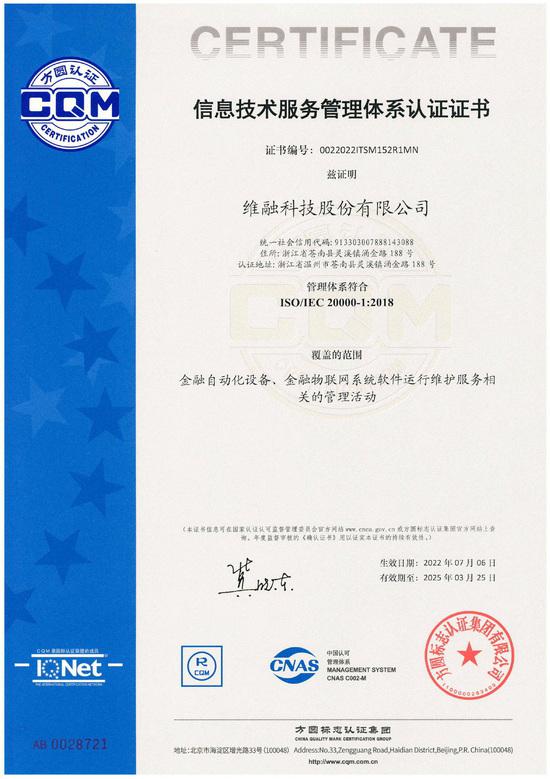 信息技術(shù)服務(wù)管理體系CQM認(rèn)證證書