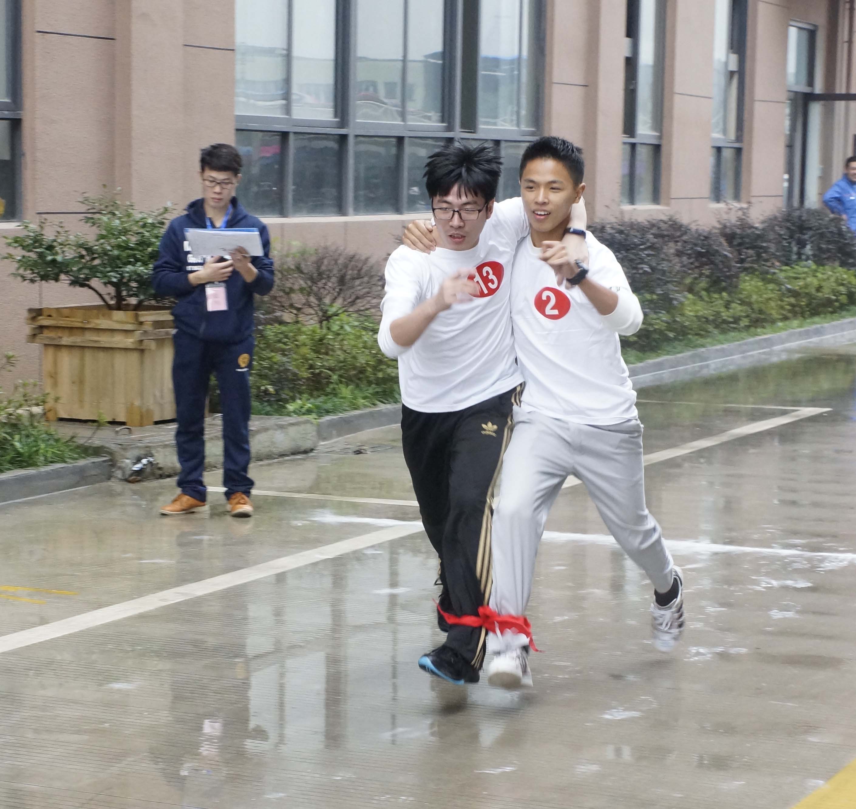 繞八字跳繩比賽也同樣揪人心弦,天空下起雨,卻絲毫未削減參賽選手的激情,個(gè)個(gè)動(dòng)作飛快,像在賽場(chǎng)上繞八字飛舞的一條長(zhǎng)龍。雨水浸濕頭發(fā)和衣服,場(chǎng)地遍地水洼,隊(duì)員們?cè)谒堇铩芭距距钡奶S,竭盡全力拼搏,最后由線路板部和清分機(jī)部為代表的第七隊(duì)獲得該項(xiàng)第一。