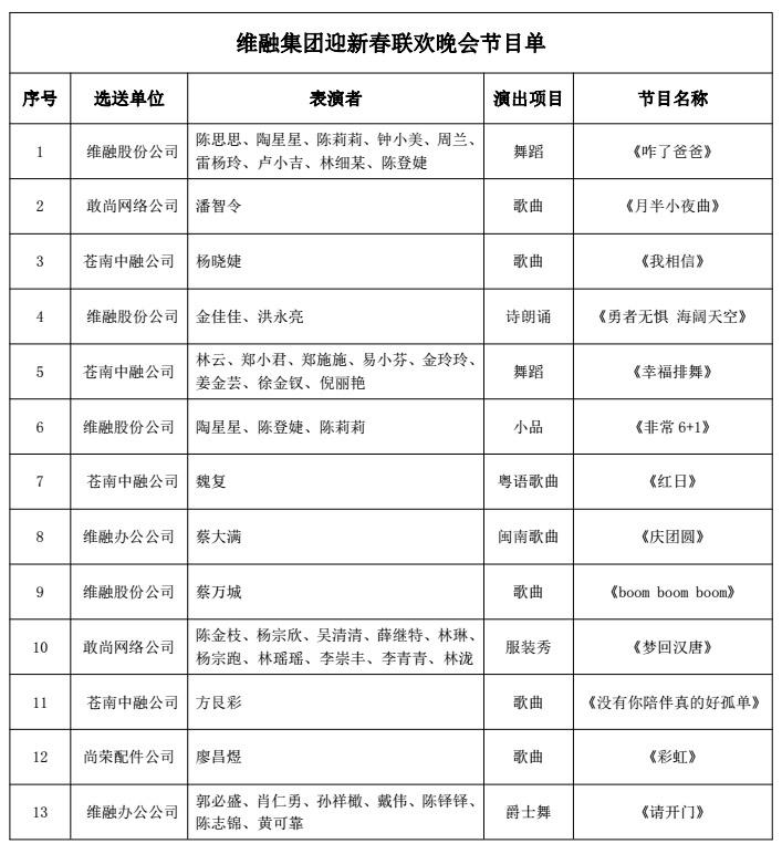 隨著2017維融集團(tuán)迎新春聯(lián)歡晚會(huì)進(jìn)入倒計(jì)時(shí),與之相配套的集團(tuán)、分公司、子公司都在緊鑼密鼓地進(jìn)行節(jié)目排練。下面,就讓小編來劇透下,看看今年集團(tuán)晚會(huì)有哪些精彩吧!