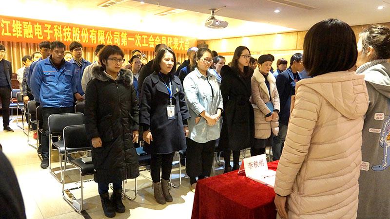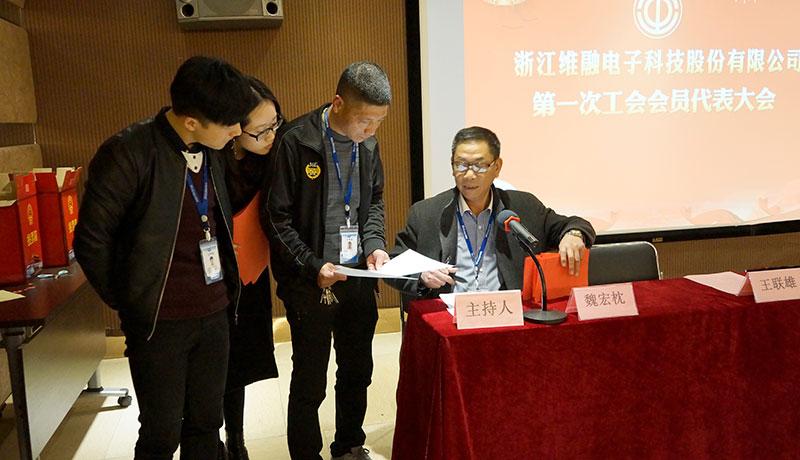 大會在雄壯的《中華人民共和國國歌》聲中隆重開幕。主持人宣讀了浙江蒼南工業(yè)園區(qū)總工會有關批復文件,工會籌備組代表李秩明作籌備工作報告,通過了第一次工會會員代表大會選舉辦法。會議依照《工會法》、《中國工會章程》采取差額選舉的辦法,經(jīng)過公平、公正、公開的無記名投票,選舉李秩明、蔡增弟、魏舜軍、楊素葉、張欽樂、陳宣總、魏小蘭為維融科技股份有限公司第一屆工會委員會委員,魏舜軍、倪麗義、陳登婕為工會經(jīng)審委委員,蔡增弟、馬長虹、羅玲為女職委委員;隨后召開的維融股份第一屆工會委員會、工會經(jīng)費審查委員會、女職工委員會會議中選舉李秩明同志為工會主席、蔡增弟同志為副主席;選舉魏舜軍同志為經(jīng)費審查委員會主任、蔡增弟同志為女職工委員會主任。